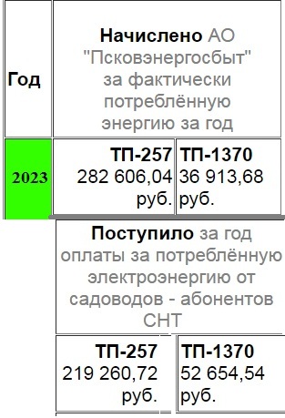Абоненты ТП-257 (остальная часть СНТ) - просим Вас - возьмите в пример опыт ТП-1370, не задерживайтесь с оплатой (до 10-го числа) - мы должны АО "Псковэнергосбыт". Промедление с Вашей стороны усугубляет общее положение - мы все в одной лодке. Подробности в "Электроэнер ... Читать дальше »